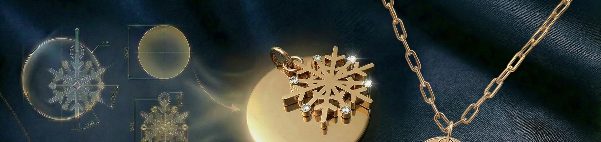 When you see the final piece, it looks simple — polished gold, a clean pendant shape, a snowflake charm that sparkles just enough.